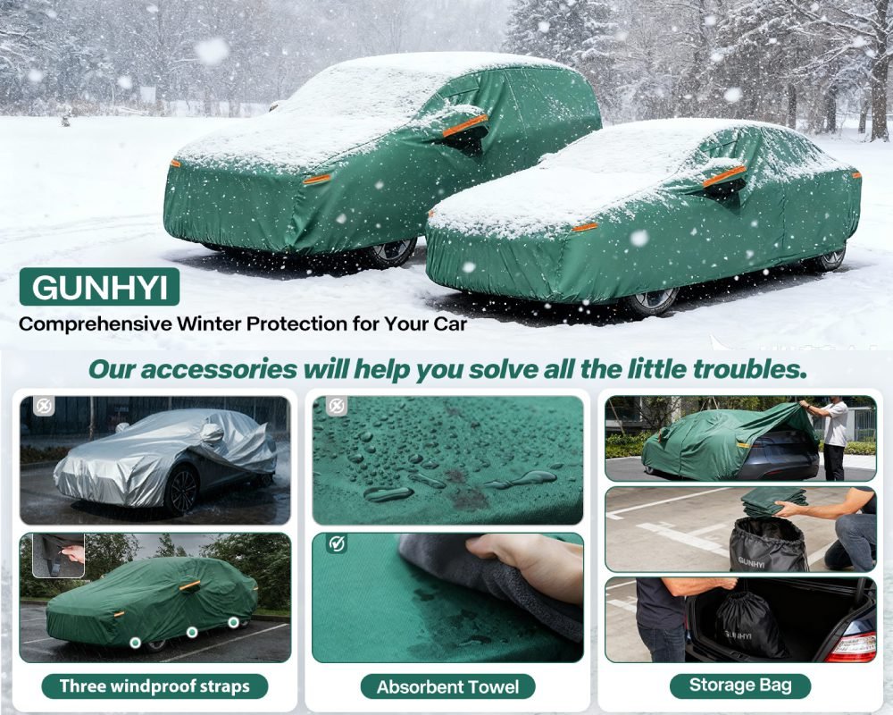 The GUNHYI Custom Fit Car Cover for Toyota RAV4 combines durability, waterproof protection, and practical features such as windproof straps, vents, and a convenient zipper. Its 16 layer construction ensures strong protection against snow, rain, and UV exposure.