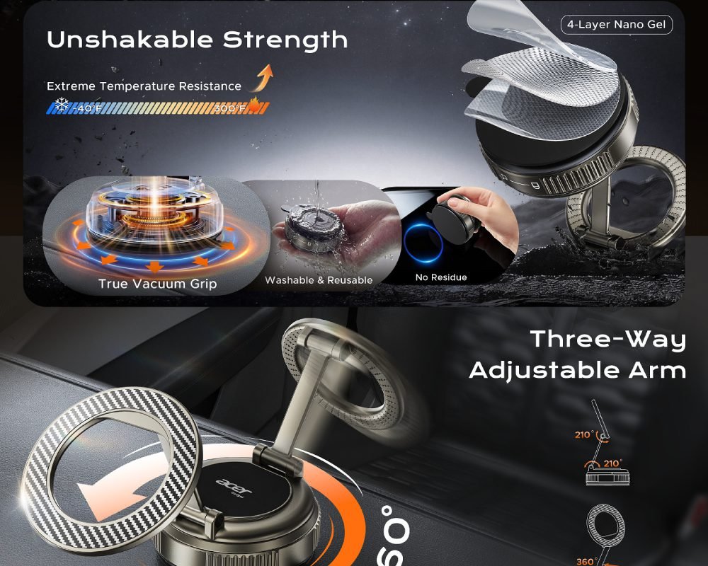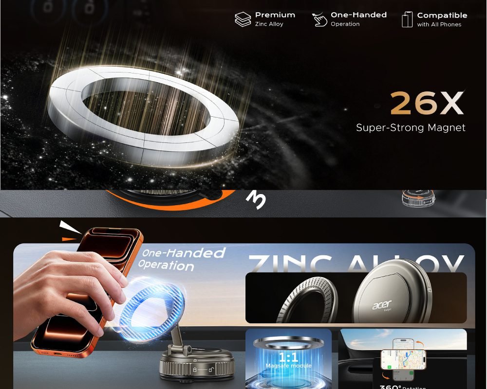 Acer’s Magnetic Car Phone Mount combines safety, convenience, and premium design into one versatile accessory. With rock-solid suction, ultra-strong magnets, foldable arm, and universal compatibility, it ensures hands-free driving while keeping your phone secure. Its compact, carbon-fiber design fits seamlessly into any car interior.