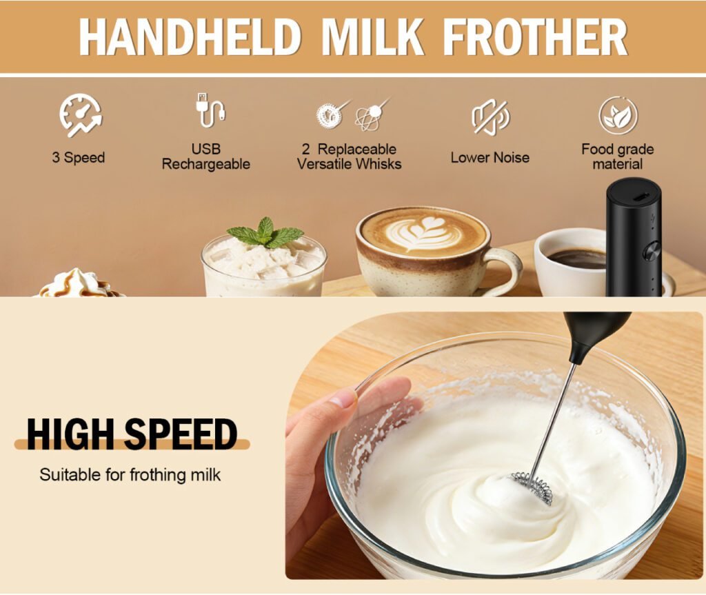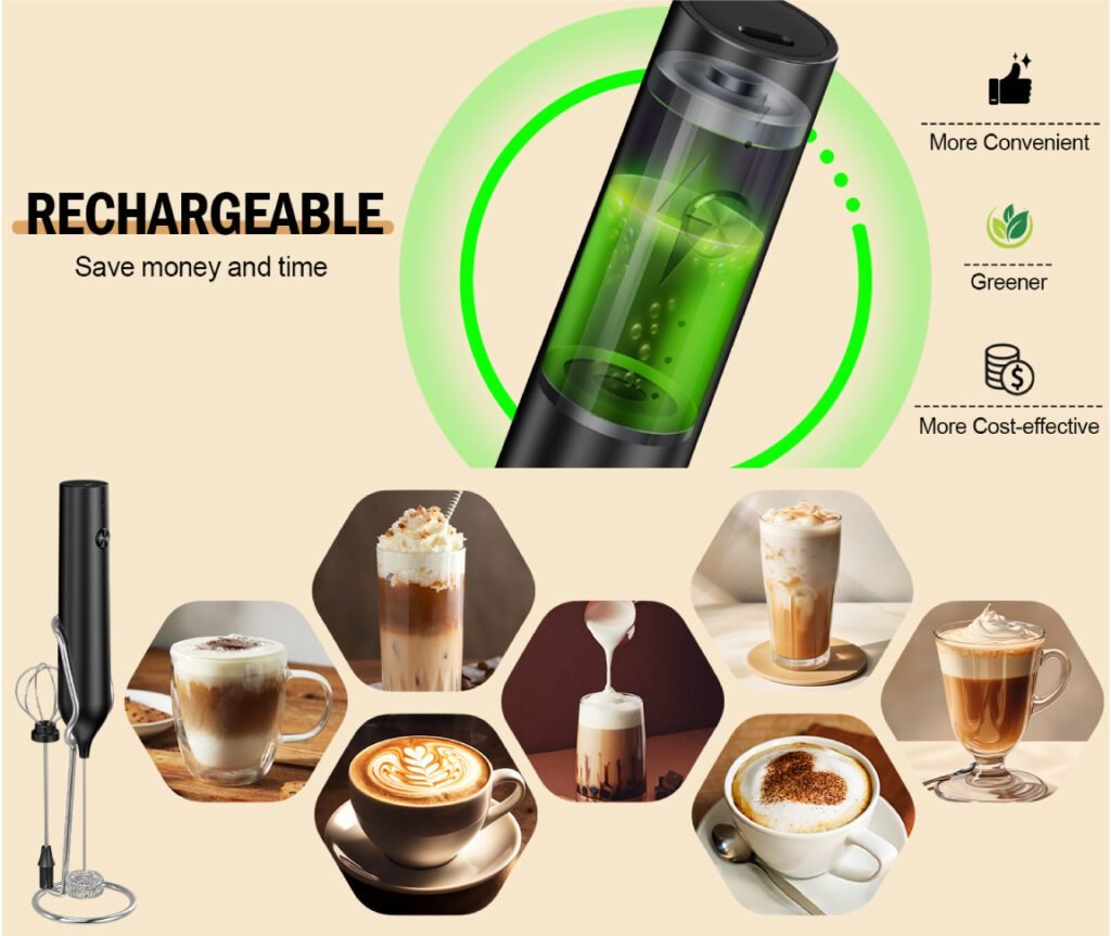 Discover the best Rechargeable Milk Frother for coffee shakes, lattes, and cappuccinos. Enjoy 3 speed control, 2 replaceable heads, powerful motor, and eco friendly rechargeable design for creamy froth in seconds.
