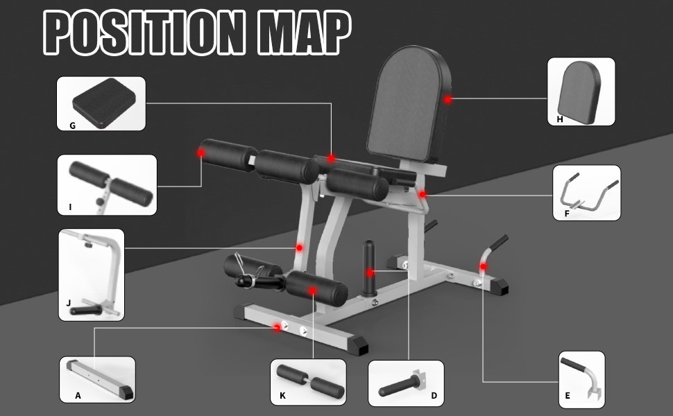 The leg workout bench features three backrest pad positions and two seat cushion degrees. This adjustment supports different body types and training angles for leg extension and curl movements.