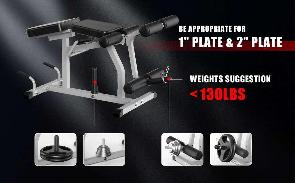 Most home gym leg machines are compatible with both 1-inch and 2-inch plates. You can use whichever matches your existing setup. Just make sure the total weight does not exceed the recommended limit, usually under 130LBS for plate loading in this type of machine.