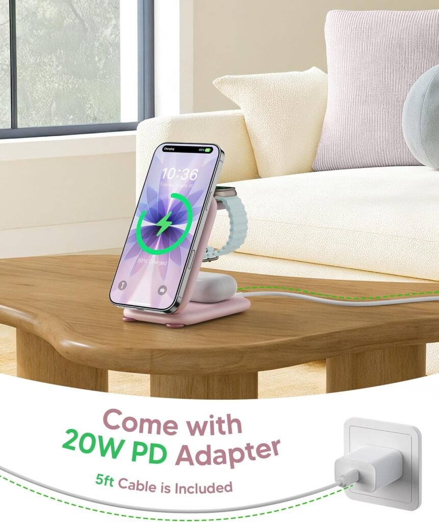 This foldable 3-in-1 charging station supports iPhone, Apple Watch, and AirPods simultaneously. With magnetic alignment, fast charging technology, and a compact travel-friendly design, it offers both convenience and efficiency. Whether you are working from home, traveling for business, or setting up a bedside charging station, this wireless charger is designed to make daily charging simple and reliable.