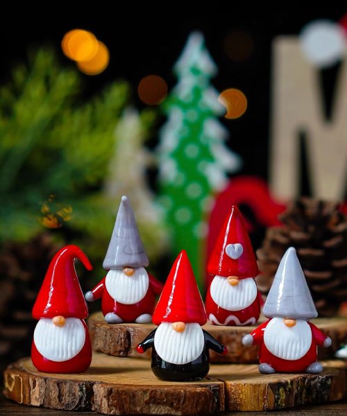 These handcrafted blown glass Christmas gnome figurines feature vibrant colors and intricate details, adding charm and elegance to any holiday décor. Durable and versatile, they make delightful tabletop, mantel, or car dashboard decorations and serve as a unique, festive gift for friends and family.