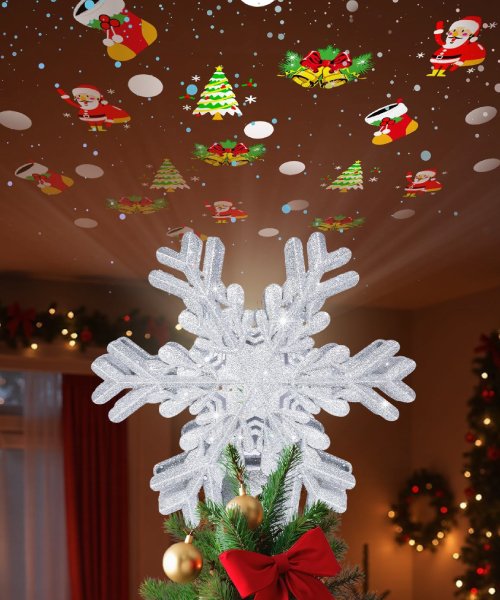 This silver snowflake Christmas tree topper sparkles with embedded glitter and features dynamic 360° projection, casting festive patterns across walls for a magical holiday ambiance. With easy installation, a 9.5ft power cord, and versatile use as a tree topper or ambient light, it’s perfect for adding charm to any home or gifting to loved ones.