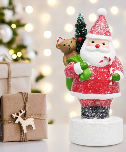 This charming Santa Claus figurine, holding a candy cane and gift bag, features bright colors and sparkling glitter sequins for a festive touch. Made from durable, high-quality materials and measuring 6.3 × 3.3 × 3.3 inches, it’s perfect for decorating shelves, mantels, desks, or giving as a thoughtful holiday gift.
