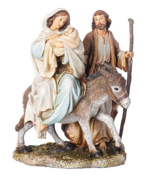 This hand-painted resin figurine depicts the Holy Family’s Flight into Egypt, symbolizing faith, courage, and divine protection. Measuring 8.25″ tall, it’s perfect for mantels, shelves, or prayer spaces and makes a thoughtful gift for religious occasions or Christmas.
